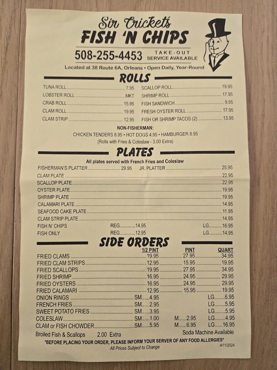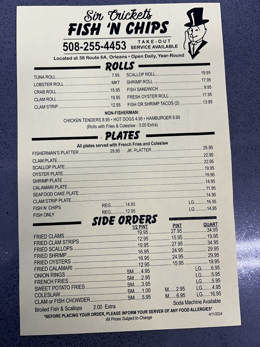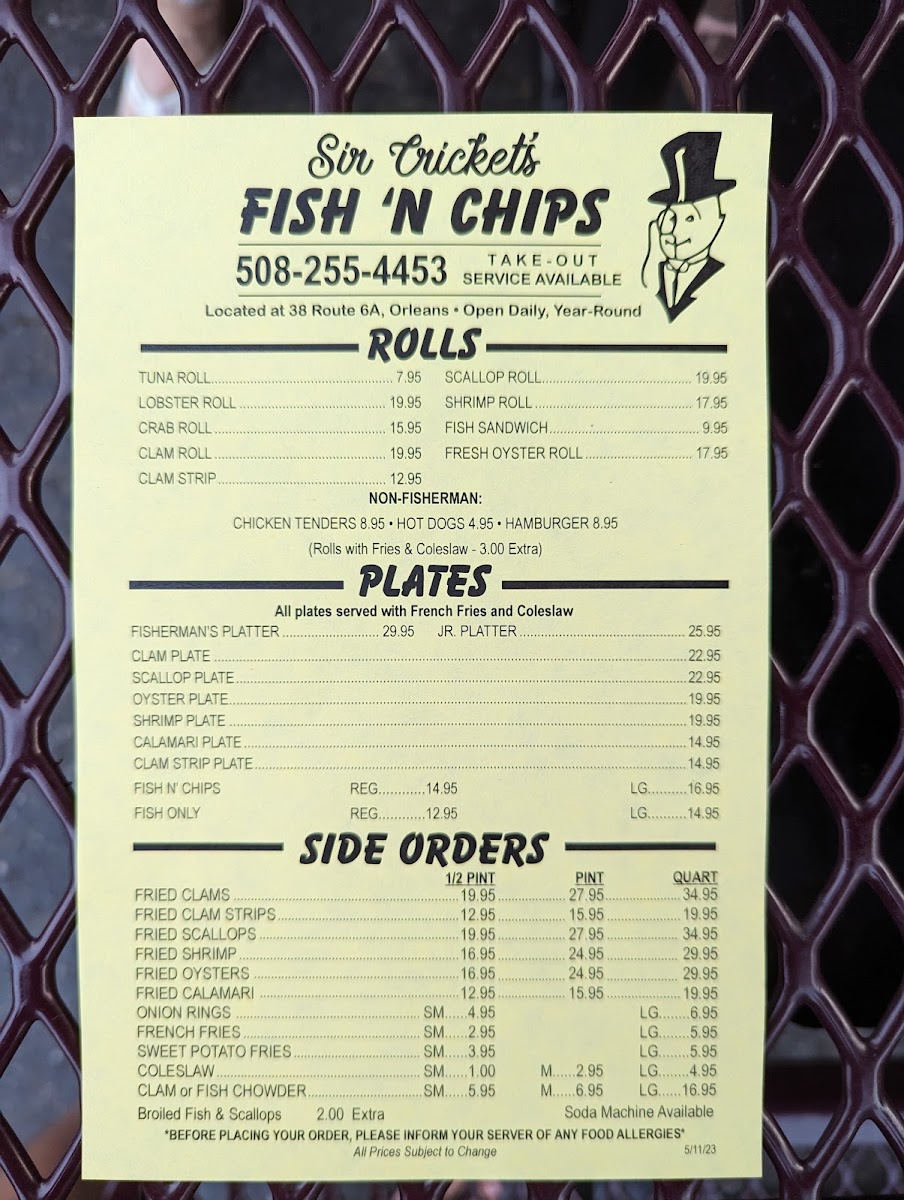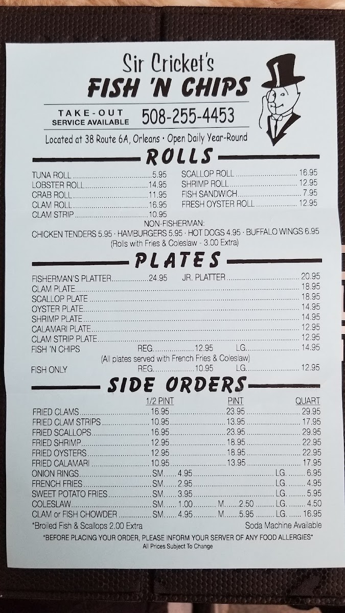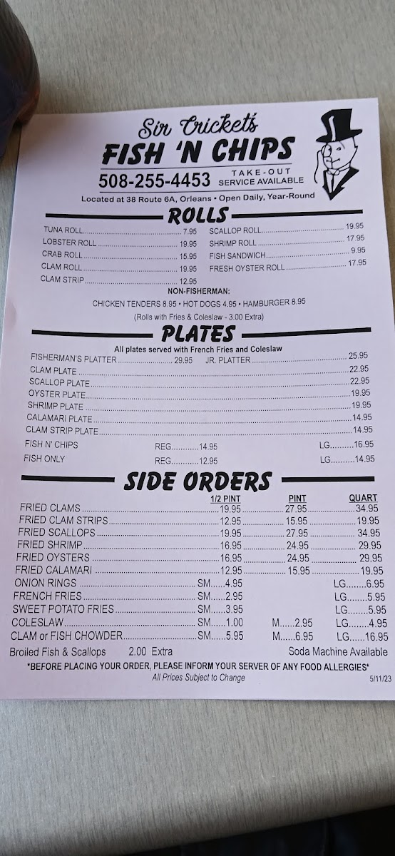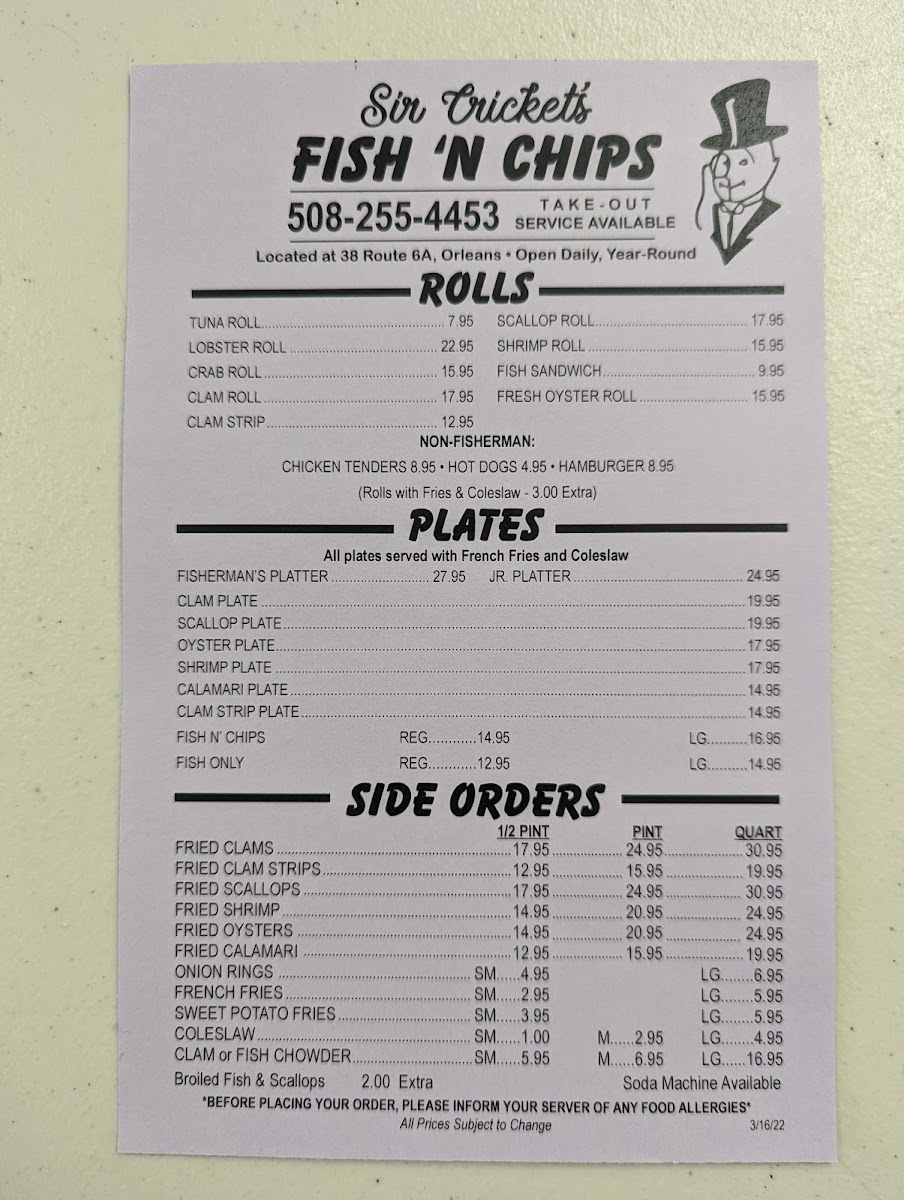 Welcome to Sir Cricket's Fish & Chips, a charming seafood haven nestled in Orleans, MA. This delightful eatery offers a menu rich with classic coastal dishes that capture the essence of Cape Cod. Diners rave about their fish and chips, a standout combination of crispy batter and fresh fish, perfectly priced for those seeking value amidst competitive tourist spots.